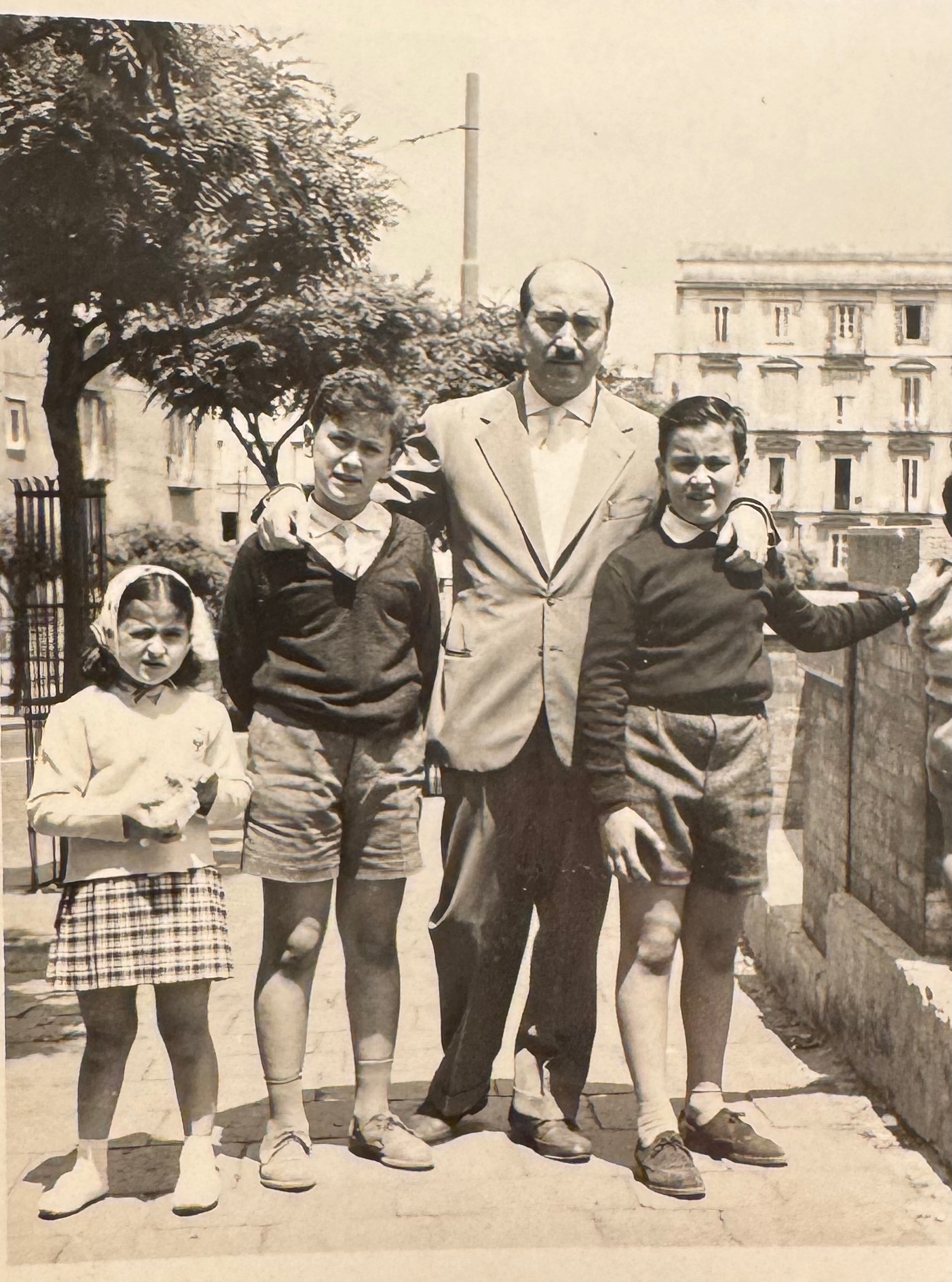 (Nella foto, papà con tutti i miei fratelli. Nell’angolo destro, di spalle e scontroso, uno spicchio di me. Enrico mi tiene la mano sulla spalla).